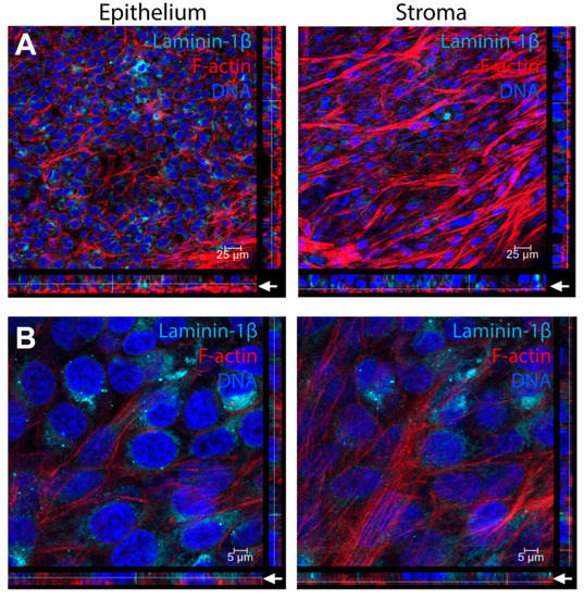 Figure 9. Laminin-1β localization in corneal epithelial–stromal co-cultures (hCE-TJ/hCF) at 3 days post-airlift. Expression of laminin-1β is predominately found within the epithelial layer at the apical side of the hCE-TJ/hCF junction, as can be seen at (A) low (40× objective) and (B) high (40× objective + zoom 4) magnification. Arrows (white) denote the region of the epithelial–stromal interface. Constructs were isolated at a total incubation period of 4 weeks in culture.