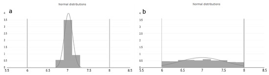 We interpret the estimated occurrence value as the probability where within the judged range the PP can potentially vary. Based on the assumption mentioned in Section 2.3, that the setpoint is the optimal operation condition of the PP, the O value is crucial for estimating the probability distribution of the operation condition within the judged range of each PP. Considering Figure 3, we see two normal distributed distributions within the judged range of a PP, exemplary from six to eight. Histogram of Figure 3a represents the probability of the lowest occurrence value and indicates that the PP operation condition is close distributed around the setpoint. Histogram of Figure 3b, on the other hand, represents the probability at the highest occurrence value and indicates that the PP value can be at any condition equally often within the judged range. The width of the distribution is the standard deviation (std) and calculated as: