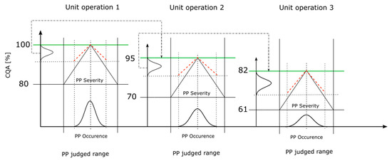 Figure 4 shows the conducted integrated process model workflow, with a process including three unit operations. The black solid slope represents the critical slope (Equation (1)) from an individual PP while the red dashed slope indicates the corresponding slope of the PP considering the S assessment within the RA (Equation (2)). The distribution on the x-axis represents the distribution of the PP values where the PP can be measured. A sharp distribution indicates a low and a broad distribution indicates a high O estimation for the PP within the RA. The black dot-dashed arrow represents the mean of the output CQA distribution, which is assumed as the starting CQA value of the following unit operation, indicated by the green line.