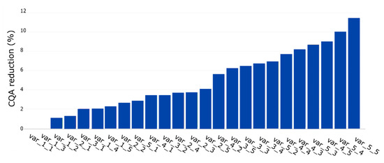 Consider Figure 5. It is shown that small changes also result in a minor increase in CQA reduction. The height of the bar indicates this. It is also demonstrated that influence also depends on the factor. Therefore, such an impact cannot be generalized, that means an element with a more significant weight than the other also results in a stronger influence proportional to the other one.