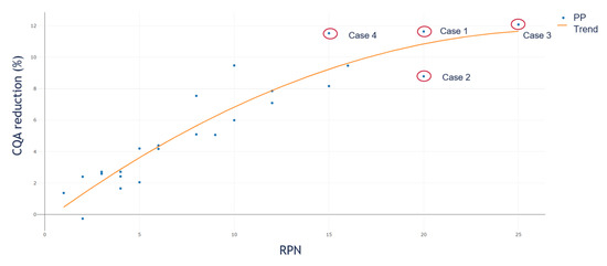 As shown in Figure 7, the common RA assessment strategy based on the RPN approach results in misinterpretation of the criticality of a PP. If we study the two PPs, within Figure 7, with an RPN value of 20 more closely, it can be seen that one of them has an S of four and an O of five (Case 1) while the other one has an S of five and an O of four (Case 2). If we consider a CQA reduction of ≥10% as critical for the process, we would identify Case 1 as a critical PP. It can be seen that Case 1 reduces the CQA by ~12% while for Case 2, the reduction is just ~8%. Cases 3 and 4 should be considered as potentially critical. Case 3 is the one with the maximum S and O, RPN equals 25 and CQA reduction of ~12%. Case 4 is the PP with an S of five and an O of three and CQA reduction of ~11%.