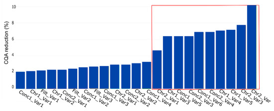 The result of the simulation by using the yield as CQA is shown in Figure 8. The plot shows the % CQA reduction per PP, with the name of the PP being a combination of the unit operation (see Table 2) and the corresponding PP name. The red marked PPs represent the parameters the expert considered as potentially critical based on their standard RPN evaluation approach.