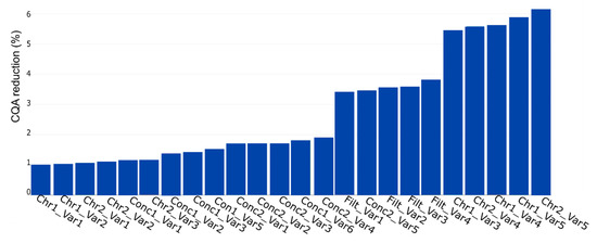In the first step, we simulated two unit operations with 10 and 15 PPs, respectively. This resulted in 25 PPs where any possible combination of S and O occurred once. To simulate the S and O influence on the process, we considered the IPM technology using the Monte Carlo approach discussed in Section 2.5. Figure 5 shows an ascending sorting of the CQA reduction per PP. The y-axis represents the reduction in CQA (%) value and the x-axis the PP. It can be seen that the PP with the smallest S and O has the lowest CQA reduction while the PP with the highest S and O has the highest one, which was expected.