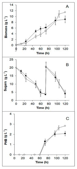 - Lopes, M.S.G.; Gosset, G.; Rocha, R.C.S.; Gomez, J.G.C.; Ferreira da Silva, L. PHB biosynthesis in catabolite repression mutant of Burkholderia sacchari. Curr. Microbiol. 2011, 63, 319–326. [Google Scholar] [CrossRef] [PubMed]