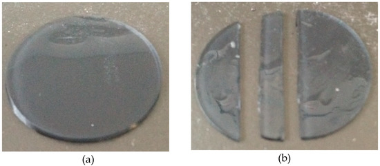 Image of an H77p0-clear hydrogel sample (77% water-content (w-c) hydrogel) before (a) and after (b) being cut into a strip.