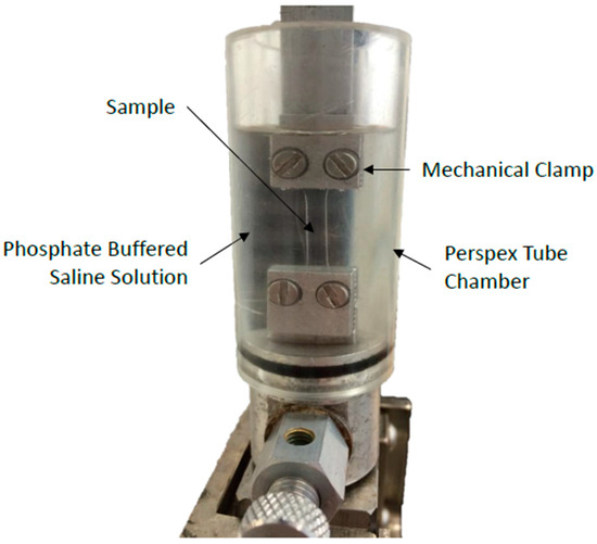The samples were secured in a set of mechanical clamps designed for use with the tensile testing machine. In order to maintain hydration throughout the testing procedure, the samples were submerged in a Perspex chamber filled with phosphate-buffered saline solution (Sigma Aldrich, St. Louis, MO, USA), Figure 2. The samples were strained at a rate of 10% min−1 until failure, and the values of the force, F, at specified time increments were recorded and converted into tensile stress, values by dividing them by the sample’s initial cross-section area, (Equation (1)) [17].