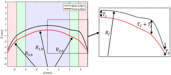 where refers to the horizontal distance from the apex, Figure 4. The back surface of the lens was rotational symmetric. This allowed the two-dimensional surface to be rotated through 180° to achieve the complete three-dimensional topography.