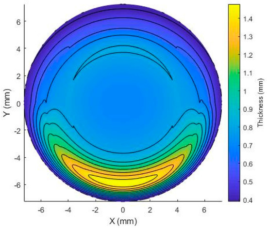 For certain values of spherical and cylindrical lens powers, it became apparent that the curvature required in the front surface was causing the two surfaces to intersect each other, leading to negative element volumes when they were later modelled in FEBio finite element software (The University of Utah, Salt Lake City, USA & Columbia University, New York, NY, USA). This problem was overcome by adding 0.01 mm to the central thickness, updating the elevation of the front surface, and checking that the thickness in all areas of the lens was greater than a minimum value of 0.1 mm. This process was repeated until the minimum thickness had been exceeded. Although this altered the overall thickness of the lenses, it was not considered to affect the refractive properties as the curvature of the front surface remained unchanged throughout.