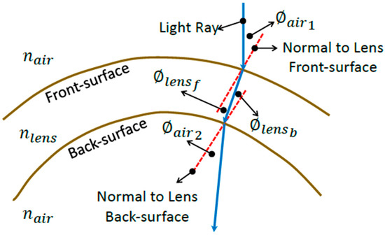 Snell’s law was then utilised to compute the angle at which the refracted ray travelled, as it passed through the depth of the lens [26]. A two-dimensional depiction of this is shown in Figure 6:
