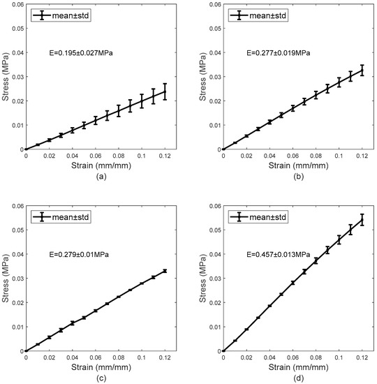 The calculated values of stress were plotted against strain, and the modulus of elasticity was calculated by computing the gradient of the graph (Equation (3)).