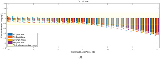 These fluctuations are far less prominent in the H64p0 material, which remains at a roughly constant EPC value of −0.1 across the entire lower range. This suggests that materials with higher moduli of elasticity may be more resilient to changes in EPC when considering negative and relatively low values of lens powers. This is in accordance with the findings in Hall et al. [31] that demonstrated through experimental methods that the effective power change induced by stiffer hydrogel lenses was far easier to predict than the EPC in those with relatively lower stiffness.
