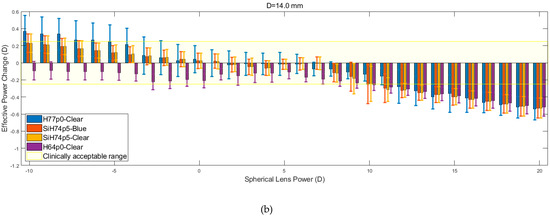 The results show that the H64p0-clear material was far more resilient to changes in EPC across the initial range (−10 to +5 D). However, lenses composed of this material, along with those made up of the two SiH74p5 silicone hydrogels, consistently left the clinically acceptable range at lower spherical lens powers compared to the H77p0-clear hydrogel lenses. Following the reduction of EPC beyond the acceptable range, the four materials demonstrated almost identical behaviour (p > 0.05 in all but one comparison, Table 4), whereby they each yielded a linear decrease in EPC, with roughly equal gradients. It was also observed that the EPC for each material tended to converge to a value of −0.5 D at a lens power of +20 D.