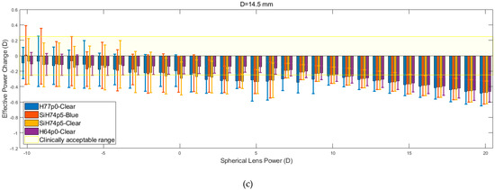 Effective power changes in spherical lenses for each of the four hydrogel materials. Results are presented for lens diameters D of 13.5 mm (a), 14.0 mm (b), and 14.5 mm (c).