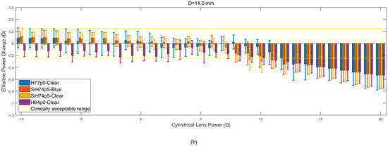 Effective power changes in cylindrical lenses for each of the four hydrogel materials. Results are presented for lens diameters D of 13.5 mm (a), 14.0 mm (b), and 14.5 mm (c).