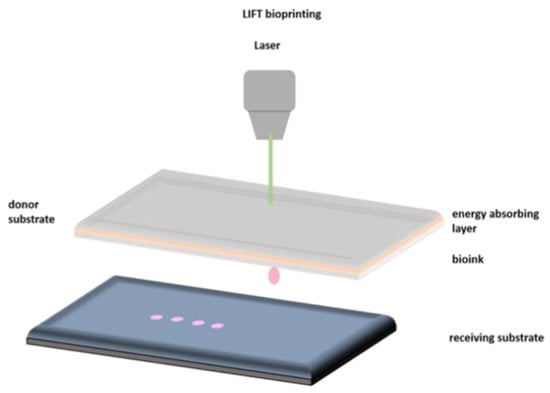 Laser-induced forward transfer (LIFT) is a technique presented more than 30 years ago by Bohandy et al. [31]. Briefly, a pulsed laser beam is applied on a donor slide (or ribbon) covered with a laser-energy-absorbing layer (e.g., gold or titanium) containing the desired material (e.g., cells, hydrogels and growth factors), followed by the evaporation of the material; this results in a high-pressure bubble jetting toward the receiving substrate that is placed underneath the donor slide, as shown in Figure 1.