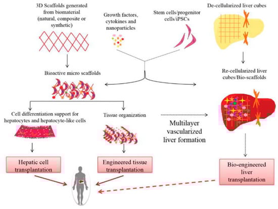 Figure 4. Schematic diagram of liver tissue engineering. Solid lines show already ongoing approaches, whereas dotted lines indicate proposed mechanisms [59].