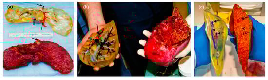 Figure 5. (a) Side view of a 3D printed liver and extracted liver of a patient, where long, short, and double arrows indicate hepatic artery, hepatic vein, and portal vein, respectively. (b) Right lobes of 3D printed and extracted livers with indications of the hepatic artery (single arrows) and portal vein (double arrows). (c) Cross-sectional views of 3D printed and extracted livers with indications of hepatic vein (single arrows) and portal vein (dotted arrows) [70].