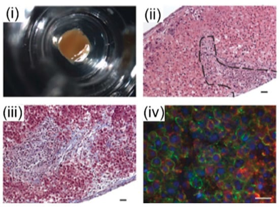 Figure 6. Organovo’s mini liver tissue: (i) A macroscopic image of liver tissue housed in a 24-well transwell, (ii) Hematoxylin and eosin (HE) staining of a tissue cross-section, (iii) extracellular matrix (ECM) deposition assessed by Masson’s trichrome staining, and (iv) Ιimmunohistochemistry (IHC) staining of the parenchymal compartment for E-cadherin (green) and albumin (red) [71].