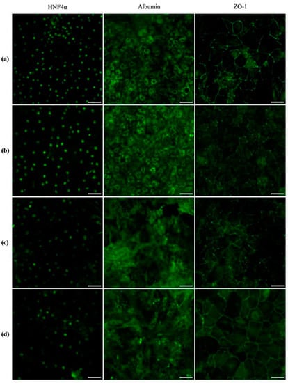 An alternative approach to liver tissue fabrication is the use of stem cells. Concerning the hepatic differentiation of induced pluripotent stem cells (iPSCs) to liver-specific cell lines. The first successful work on bioprinting a mini-liver from both human-induced pluripotent stem cells (hiPSCs) and human embryonic stem cells (hESCs), which have matured to be hepatocyte-like cells, was reported by Faulkner-Jones et al. using a valve-based bioprinting system which did not adversely affect cell viability (~84%) [83]. The group built a 3D alginate matrix, and the analysis was carried out after 21 days of differentiation protocol, revealing peak albumin secretion that meant the construct was hepatic in nature [81], as shown in Figure 7 [84]. Recently, Choi et al. [85] used a nozzle 3D bioprinter to fabricate a liver-mimicking architecture using primary hepatocytes, and they demonstrated the benefits of co-cultured primary hepatocytes and mesenchymal stem cells (MSCs). This research indicated that the expression of hepatic genes and proteins was higher for up to seven days in the 3D hepatic architecture, and that the primary hepatocyte cell morphology was stable.