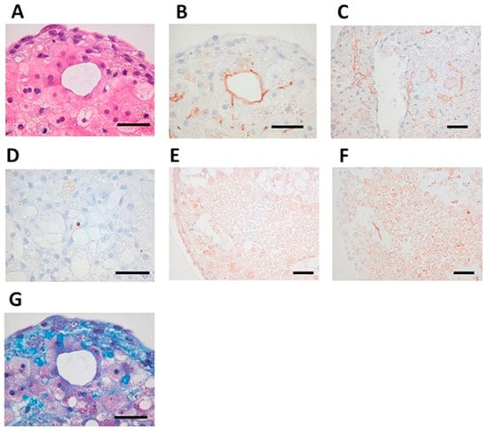 Figure 8. Self-organization in bio-printed human liver tissues. (A) Hematoxylin and eosin stain (HE) staining shows structure of bio-printed liver tissue on day 50. (B) Immunostaining with the MRP2 antibody detected bile acid transporters (day 50). (C) Immunostaining with, cluster of differentiation 31 (CD31) antibody detected blood vessel-like and sinusoid-like structures (day 14). (D) Terminal deoxynucleotidyl transferase dUTP nick end labeling (TUNEL) staining detected little apoptosis (day 60). (E) Immunostaining with the OAT2/8 antibody detected drug uptake transporters (day 44). (F) Immunostaining with MRP2 antibody showed tissue distribution (day 44). (G) Masson’s trichrome staining shows collagen accumulation (day 50). Black bars represent 50 μm [82].