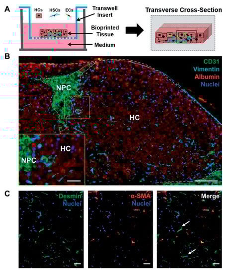 Figure 9. 3D bioprinted tissue exhibits a compartmentalized architecture and maintains hepatic stellate cells in a quiescent-like phenotype. (A) Illustration of a transverse cross-section of bioprinted tissue on a transwell insert comprising hepatocytes (HCs) and compartmentalized endothelial cells (ECs) and hepatic stellate cells (HSCs). (B) The organization of non-parenchymal cells (NPCs) is depicted with CD31 and vimentin staining to mark ECs and HSCs, respectively. Albumin is used to denote the hepatocellular compartment (HC). Scale bar = 100 μm, inset scale bar = 25 μm. (C) HSC activation status was examined using desmin (generic marker) and Alpha-smooth muscle actin (α-SMA) (activation marker). Quiescent HSCs are denoted with white arrows. Scale bar = 50 μm [95].