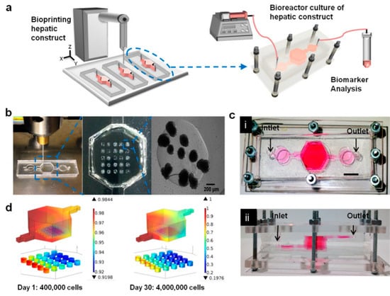 Figure 10. (a) Schematic of the hepatic bioreactor culture platform integrated with a bioprinter and biomarker analysis module. (b) Bioprinting photocrosslinkable Gelatin-methacryloyl (GelMA) hydrogel-based hepatic construct within the bioreactor as a dot array. (c) Top-view (i) and side-view (ii) of the assembled bioreactor with the inlet and outlet fluidic ports as indicated. Scale bar = 1 mm. (d) Oxygen concentration gradient in the bioreactor, considering the oxygen uptake of, case A: 400,000 hepatocytes on day one (16,000 cells per dot), and case B: 4000,000 hepatocytes on day 30 (160,000 cells per dot) [110].
