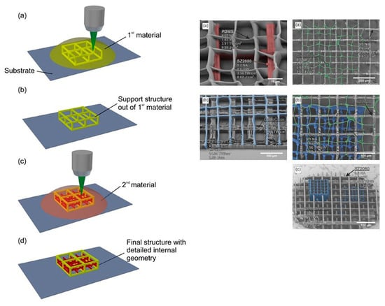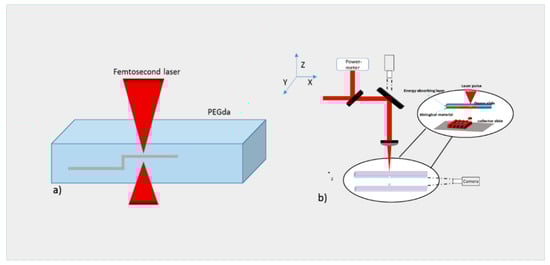 Another advantage that laser-based techniques offer is the use of lasers for the creation of the 3D matrix and the selective deposition of cells with high precision. Ovsianikov et al. [120] presented this approach by utilizing lasers to polymerize an acrylated poly(ethyleneglycol) (PEG) monomer for the fabrication of a cell scaffold and the direct laser printing of two different types of cells on the fabricated scaffold (Figure 13).