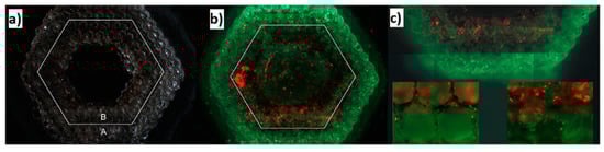 Figure 15. (a) Fabricated fibrin gel scaffold with hexagonal shape. (b) Cells cultured for seven days [124].