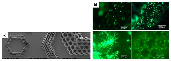 Figure 14. (a) SEM images of 2PP fabricated scaffolds. (b,c) Fluorescence microscopy images after the deposition of two cell lines in the same scaffold [120].