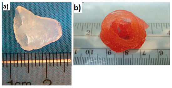 Ink jet printing techniques have been frequently used for the control of cells growth in a matrix by the printing of protein solutions [131], the printing of cells [131], or the printing of the 3D scaffold. In the field of inkjet printing of scaffolds, impressive results were presented by Xu et al. [132] with the printing of a functional 3D scaffold for cardiac tissue application (Figure 16a). Also, Duan et al. who printed valve network (Figure 16b) [54].