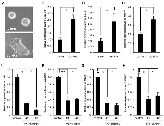 - Nukuda, A.; Sasaki, C.; Ishihara, S.; Mizutani, T.; Nakamura, K.; Ayabe, T.; Kawabata, K.; Haga, H. Stiff substrates increase YAP-signaling-mediated matrix metalloproteinase-7 expression. Oncogenesis 2015, 4, e165. [Google Scholar] [CrossRef]