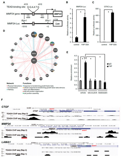 The nuclear translocation of YAP has been shown to be dependent upon actomyosin contractility [7,8,9,10]. We thus set out to investigate the role of actomyosin in the interaction between YAP and the MMP24 promoter. Treatment with latrunculin A, an inhibitor of actin polymerization, or blebbistatin, a myosin II inhibitor, diminished the binding of YAP to the MMP24 promoter (Figure 2E), indicating the importance of actomyosin activity for YAP-dependent MMP24 expression.