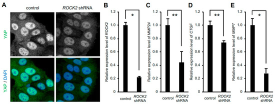 Knockdown of ROCK2 decreases MMP24 expression. Cells were infected with ROCK2 shRNA-expressing retrovirus. Confocal images of cells stained for YAP (green) and DAPI (blue) are shown (A). The expression of ROCK2 (B), MMP24 (C), CTGF (D), and MMP7 (E) were evaluated by quantitative real-time PCR. Each bar represents the mean ± S.D.; n = 3. Asterisks represent p < 0.005. Double asterisks represent p < 0.01.