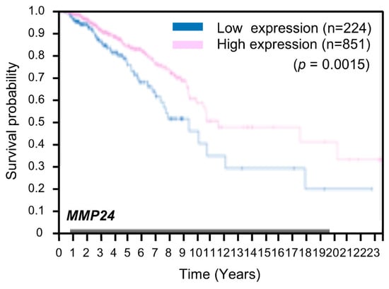 We proceeded to examine whether expression of MMP24 affects tumor aggressiveness. To this end, we investigated the correlation between MMP24 expression and the survival rate in breast cancer patients using the Human Protein Atlas database (https://www.proteinatlas.org). The result showed that breast cancer patients with lower levels of MMP24 expression exhibit worse survival rates overall (Figure 4). Further investigations revealed that also in other cancers including lung cancer, pancreatic cancer, and renal cancer, patients with lower levels of MMP24 expression exhibit lower overall survival rates (Figure 5A–C). In contrast, although not statistically significant (p = 0.12; Figure 5D), there was a tendency that colorectal cancer patients with higher levels of MMP24 expression exhibit lower survival rates. While the elastic modulus of tumor ECM is correlated with the aggressiveness of cancer cells [1,2,20,21], these results imply that in cancers such as breast cancer, lung cancer, pancreatic cancer, and renal cancer, MMP24 may retard tumor progression under the stiff environment of the cancer niche.
