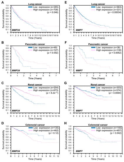Correlations between MMP24 or MMP7 expression and the survival rate of breast, lung, pancreatic, renal and colorectal cancer patients were analyzed using the Human Protein Atlas database (https://www.proteinatlas.org) [17].