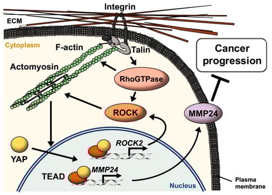 Schematic model for MMP24 expression promoted by extracellular matrix (ECM) stiffening. Integrins bind to ECM and induce the formation of focal adhesions, leading to actin polymerization via the activation of Rho GTPases such as Rho, Rac, and Cdc42. Rho GTPases also induce activation of myosin via activation of ROCK. Actomyosin contraction enhances activation of this integrin signaling pathway via conformational change of the proteins as mechanosensors including integrins and talin in an ECM stiffness-dependent manner. Increase in the number of actin filaments promotes YAP nuclear translocation, resulting in induction of ROCK2 and MMP24 expression via TEAD activation. MMP24 expression attenuates the progression of various types of cancers such as breast cancer, lung cancer, and renal cancer.