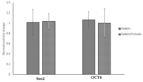 Gene expression in gelatin and gelatin/pullulan electrospun groups normalized to control. Control groups are cells cultured with 5 mg/mL gelatin or 5 mg/mL pullulan/gelatin.
