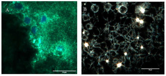To confirm that the cells were embedded within the scaffold, the cells were labeled using a green CMFDA cell tracker dye (Invitrogen, Oregon, Germantown, MD, USA) before electrospinning; they were labeled with DAPI afterward. Samples were imaged using CytoViva’s patented enhanced darkfield transmitted light condenser (NA 1.2–1.4) coupled with CytoViva’s proprietary Dual Mode Fluorescence (DMF) module. These components were configured on an Olympus BX51 upright microscope using an Olympus100X oil UPL Fluorite objective (NA 0.60–1.30) with adjustable iris objective optimized for darkfield imaging. The light source used was Prior Lumen 200 with a metal halide lamp and variable light attenuation. Optical images were captured using a DAGE-MTI XLMCT cooled CCD camera with a 7.4 µm pixel size.