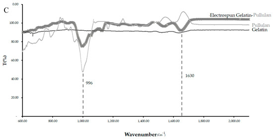 The primary hydroxyl groups at the C-6-position were available in the pullulan macromolecule (Figure 4C). However, there were no hydroxyl groups at the C-6-position in gelatin. This band can show the glycosylation between the gelatin and pullulan molecules or the formation of the interchain hydrogen bond in the composite fiber. The amide I (AmI) band at 1630 cm−1 in pullulan/gelatin was the strongest among the three and shifted slightly to a higher wavelength, which can be associated with AmI sensitivity to hydrogen bonding at the C=O group [32,33]. Hydrogen bonding plays a significant role in the stabilization of protein secondary structure which can result from the presence of pullulan here [34].