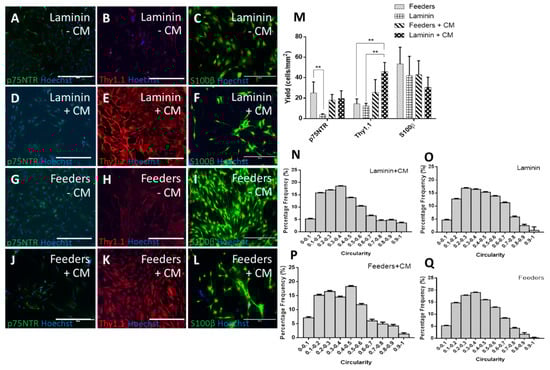 The morphology of S100β-positive cells was analysed using an automated circularity macro in ImageJ (Figure 1N–Q). Numerical analysis revealed that there was no significant difference between the distributions for feeders versus feeders with CM, and both conditions had a left skew (skew = 0.4 and 0.5, respectively). The laminin condition had a skew value of 0.3 and a kurtosis value of −0.8. When CM was added to the laminin condition, the distribution was significantly different from the standard laminin condition (Kolmogorov–Smirnov, p = 0.01). The distribution with CM had a less flattened distribution (kurt = −0.3 compared to −0.8) and a more pronounced left shift (skew = 0.7 compared to 0.3). This was a stronger shift than the feeder conditions. This was significant as this was the condition with the most Thy1.1-positive cells. The most likely option was that spindle-shaped OECs were also expressing Thy1.1, as well as S100β. Co-labelling of these antibodies was not carried out in this study due to the lack of consistency experienced with the separate S100β antibody, which meant the Thy1.1 and S100β antibodies used were raised in the same species. The literature indicated that it is possible that OECs do co-express p75NTR and Thy1.1 [,,,] and Thy1.1 and GFAP [], so the assumption that Thy1.1 is a contaminating cell marker may need to be re-examined. Due to the lack of putative OEC markers [,], these cells are poorly characterised, and this presents one of the major challenges of OEC research.
