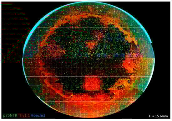 Assembled fluorescent micrograph of a cell population derived from rat olfactory mucosa cultured on a human feeder layer of olfactory fibroblasts. Images were taken at 100× total magnification in a 24 well plate (diameter = 15.6 mm) and stitched together using PanoramaPro2. It can be seen from this stitched image that there are definite populations present in the well plate. There are distinct areas of Thy1.1 (red) that do not appear to be dispersed with the areas of p75NTR (green). This variety in present populations explains the large error bars found in the cell counts. When multiple views were taken for counting, the purity could range from 0–100%, which relates to a large standard deviation.