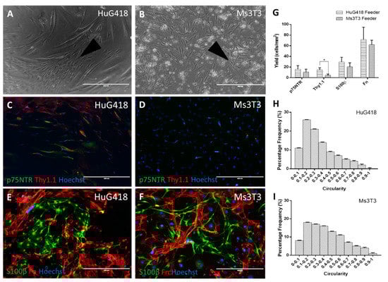 Cells were fixed after 14 days of culture and stained for OEC biomarkers p75NTR and S100β and fibroblast biomarkers Thy1.1 and Fn (A–D). Positive cells were quantified in ImageJ and graphed as the yield of positive cells in the image area (E–G). Circularity was used as a measurement of morphology, and positive S100β cells were analysed for their circularity (H,I). The scale bars represent 400 µm. Data are the means ± SEM, n = 3.