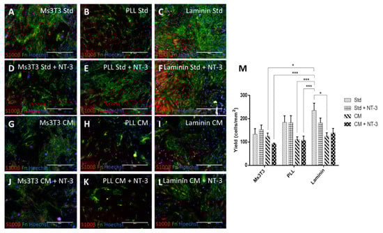 For the experiments involving PA5 cells, wells were coated either with Ms3T3 feeders, poly-l-lysine (PLL), or laminin. PA5 cells were plated at 6000 cells/cm2 and cultured for five days. After five days, cells were fixed and stained for S100β and fibronectin. Neurotrophic factor 3 (NT-3) was added to some media conditions at 50 ng/mL as the literature indicated that NT-3 encourages the neurological repair phenotype in OECs [].