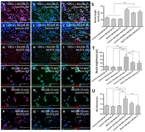When the neurite length per neuron was examined (Figure 5T), the co-culture on laminin with standard media showed significantly longer neurites per neuron (76.0 ± 11.2 μm) compared with every other condition (43.6 ± 5.5 μm on laminin with CM and 41.0 ± 10.6 μm on Ms3T3 with CM, one-way ANOVA, Bonferroni post-hoc, p < 0.01). All conditions without OECs performed similarly to each other (22.8 ± 2.4 μm, 17.8 ± 2.3 μm and 17.9 ± 1.1 μm on laminin with standard media, laminin with CM and Ms3T3 with CM, respectively).