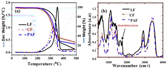 3.1.1. Compositional Analysis of Pristine and Treated Linen Fiber