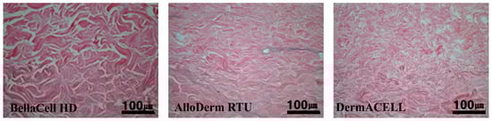 Decellularization assessment. The extracellular matrix of acellular dermal matrices (ADMs) was assessed by H&E staining (scale bar = 100 μm). The BellaCell HD and DermACELL display complete decellularization while the AlloDerm Ready to Use (RTU) shows cellular debris between the figures.