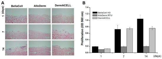Biocompatibility assessment. (A) Cell adhesion on the surface of ADMs was observed under microscope after staining with H&E (B) Cell proliferation was evaluated by a 3-(4,5-dimethylthiazol-2-yl)-2,5-diphenyltetrazolium (MTT) assay. Cell adhesion and proliferation in a span of 1, 7, and 14 days. Figure 2A is a representation of cell adhesion, while Figure 2B shows the cell proliferation rate and incubation days. The cells overgrew with time in the BellaCell HD in comparison to the other two matrices, and the AlloDerm RTU cell growth was viewed at the dent. Each datum represents the ±SEM of three independent experiments.