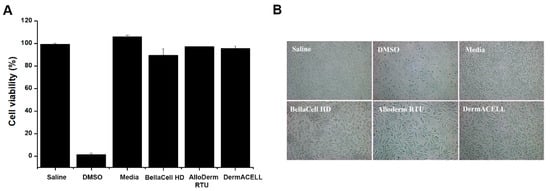 MTT assay showed that all three products had a cell viability of over 90%, indicating no cytotoxicity as illustrated in Figure 3A. In the cytotoxicity assay, a significant decline in cell count was observed in the positive control using DMSO. There was a rise in cell count in the negative control, as seen under a light microscope at 200× magnification (Figure 3B). In all test groups using BellaCell HD, AlloDerm RTU, and DermACELL, there was a growth with a spindle-like structure (Figure 3B).