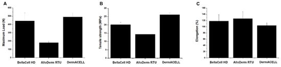 Uniaxial tensile test. (A) Maximal load, (B) tensile strength, and (C) elongation. Figure 4A shows the 444.94 N break for BellaCell HD, AlloDerm RTU 181.92 N, and 492.11N for DermACELL. The tensile for the BellaCell HD, Alloderm RTU, and DermACELL is 22.44 MPa, 14.34 MPa, and 26.12 MPa (Figure 4B). Figure 4C represents the elongation ratio of 118.41%, 126.38%, and 104.13% for BellaCell HD, Alloderm RTU, and DermACELL products, respectively. Each datum represents the ±SEM of three independent experiments.