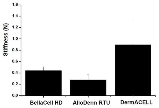 A biomaterial requires mechanical strength to uphold integrity until full regeneration of the tissue and has to sustain space for the cell ingrowths and nutrient absorption in vitro, thereby supporting the loadings in vivo []. The scaffold should be able to match its characteristics to those of initial tissues to avoid pressure shielding and offer the cell appropriate mechanical cues []. The stiffness testing showed that DermACELL had the highest stiffness of 0.90 N/mm, while those of AlloDerm RTU and BellaCell HD were measured 0.28 N/mm and 0.44 N/mm, respectively, as illustrated in Figure 5.